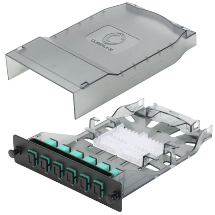 Cleerline™ HD Splice Cassettes provide an efficient solution for managing spliced fibers. This cassette comes preloaded with 6 strand multimode SC fiber pigtails, and its corresponding adapter plate.