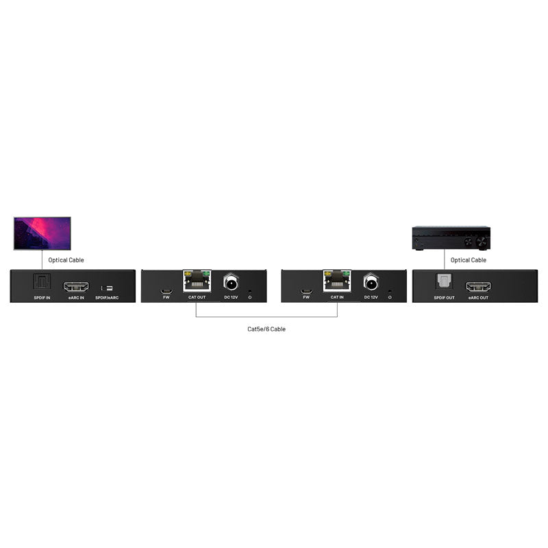 - Extends eARC/ARC or optical digital audio signals over a single Cat5e/6 cable