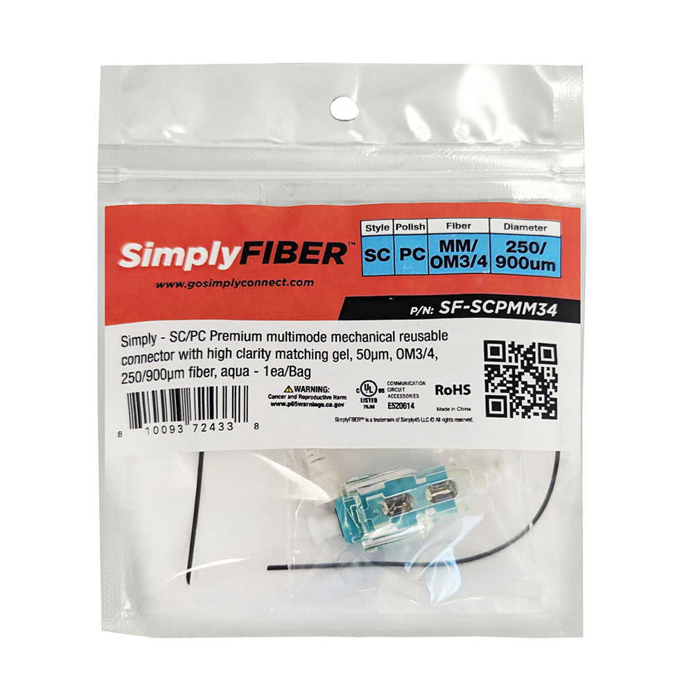 Simply – SC/PC Premium multimode mechanical reusable connector with high clarity matching gel, 50µm, OM3/4, 250/900µm fiber, aqua – 1ea/Bag