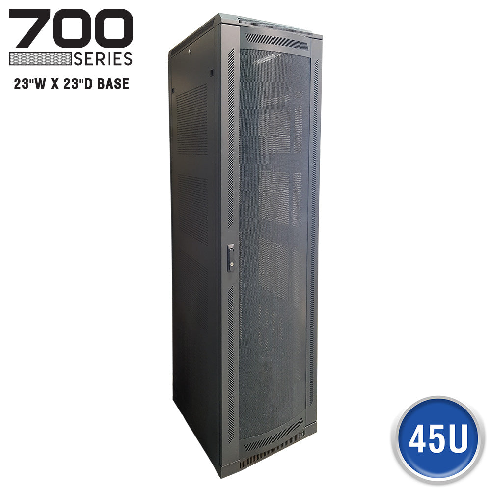 Quest 700 Series Floor Enclosures have a 23″ width by a 23″ depth, featuring a reversible vented steel mesh front door and rear vented split doors for access and ventilation. Ideal for 19” wide mounting on front and rear rails. They come complete with casters, floor levelers, a grounding bus, as well as two 80 CFM boxer fans for ventilation and air flow. These cabinets are constructed of heavy-duty steel, coming in a black powdercoat microfinish. Available assembled or non-assembled in knockdown boxes.