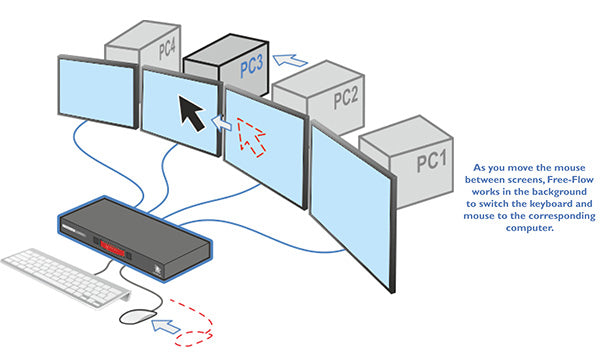 - Seamless switching: Free-Flow allows users to switch intuitively between target computer by moving the mouse pointer from screen to screen