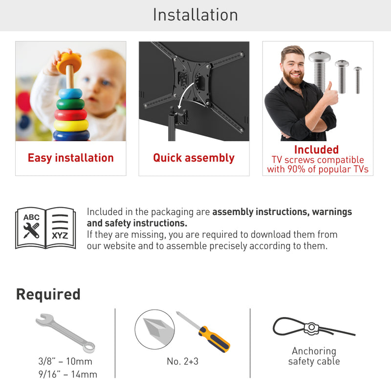 Please check the list of included screen-connection screws in the assembly instructions. If your screen requires different screen-connection screws, please purchase them in your local hardware store.