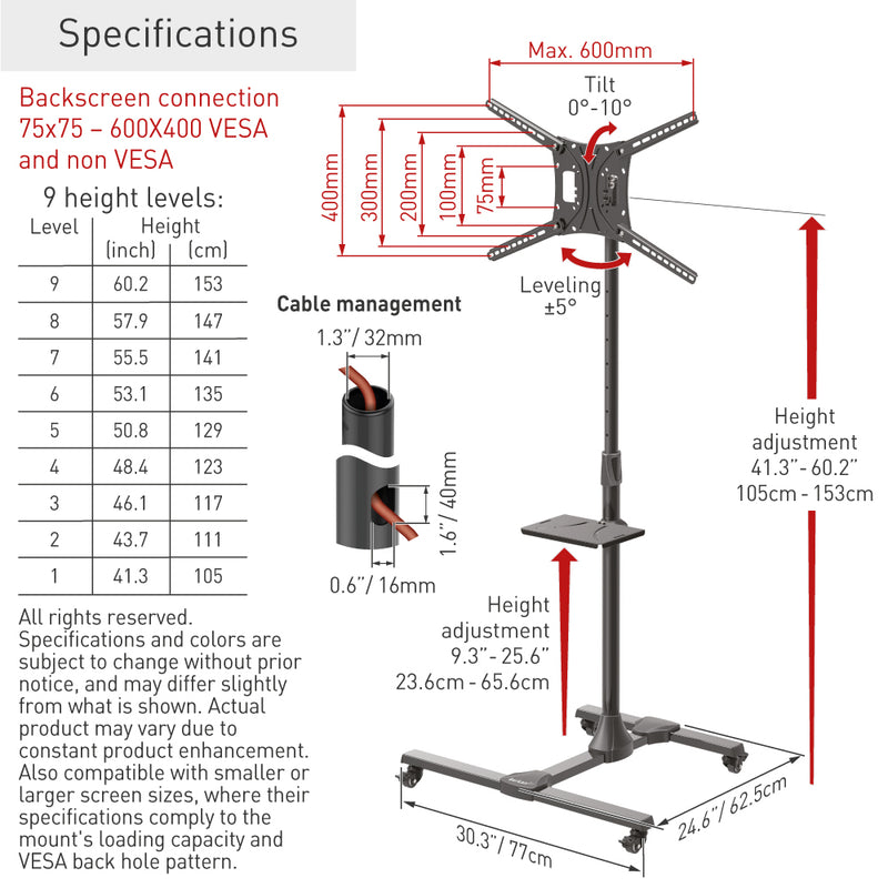 9 optional screen height levels from 41"/ 105cm to 60" /153cm and height adjustment of the shelf as well.