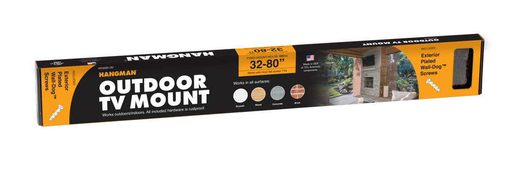 Create your outdoor entertainment center with ease and security! Hangman’s patented Outdoor TV Mount installs into any surface in minutes, no studs or anchors required. WallDog screws need no anchors, even in concrete, drywall or brick. All-weatherproof components are aircraft-grade aluminum, stainless steel, or exterior-plated. Installs with just a screwdriver into wood or drywall, or with a small pilot hole in concrete, brick or masonry. A high-quality masonry bit is included, as well as a level.