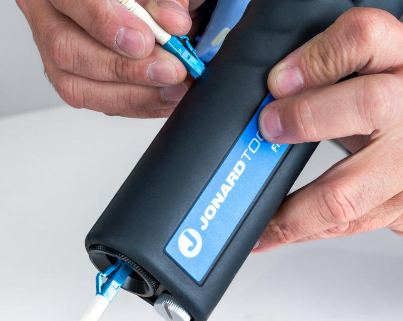 Jonard’s fiber inspection microscope has 200x magnification, a focus wheel, and features 2.5 mm (FC/SC/ST) and 1.25mm (LC) adapters for use on most fiber connectors