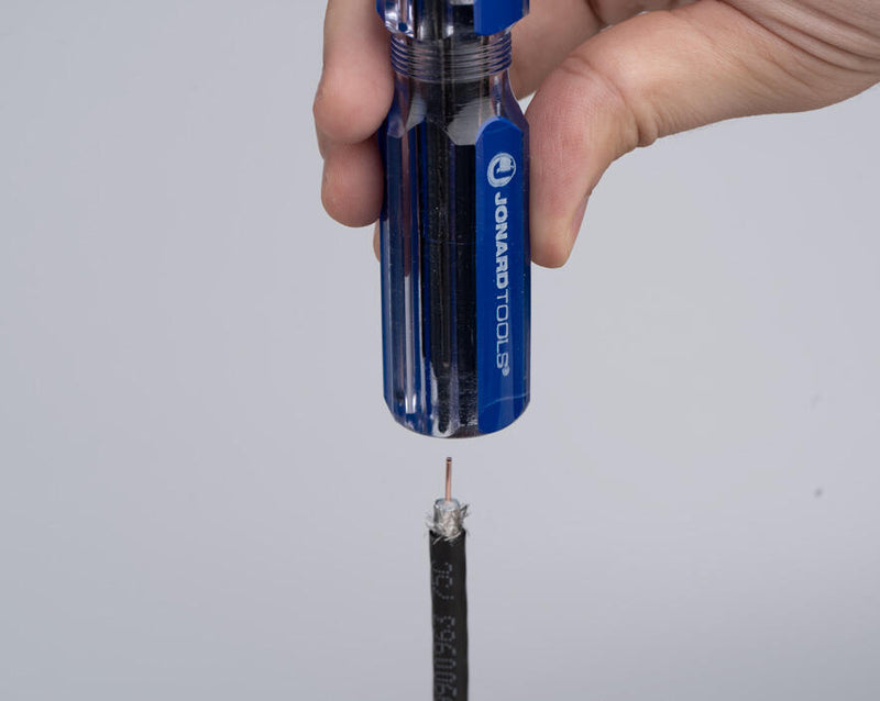 - Insertion end of tool is used for RG6, RG59, and RG11 F Connectors
