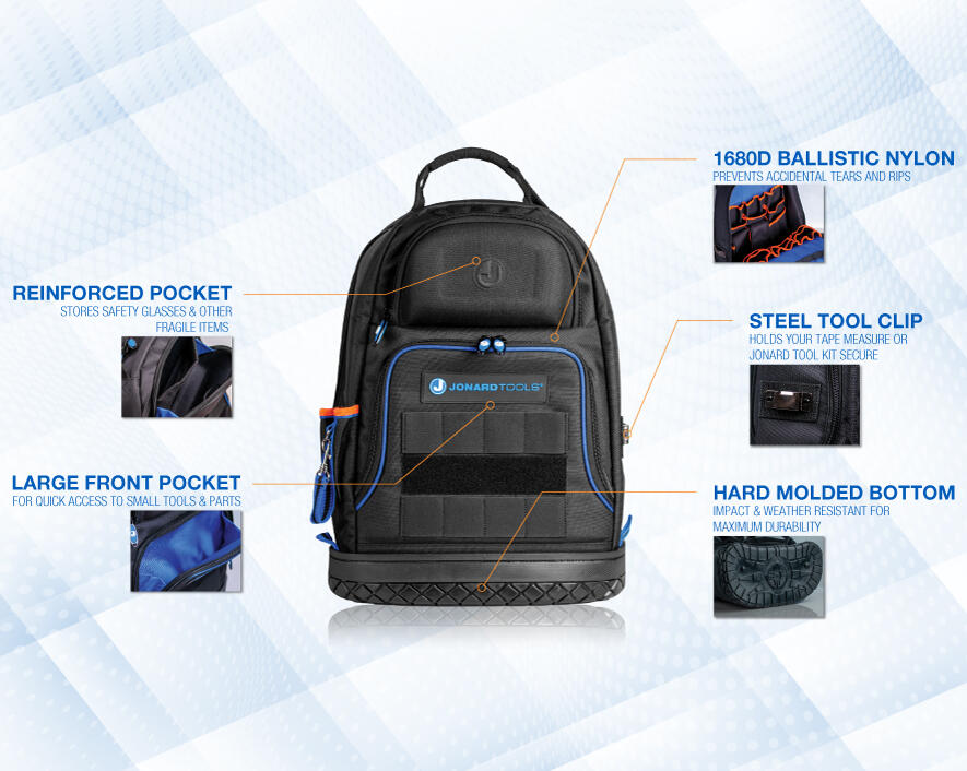 Jonard Tools' Technician's Tool Bag Backpack features 36 organizer pockets and 12 pocket straps to hold all your tools in place with a durable water resistant base to protect it from the elements. It also has a hard, molded front pocket for delicate items, like safety glasses, and a front zipper to hold loose parts.