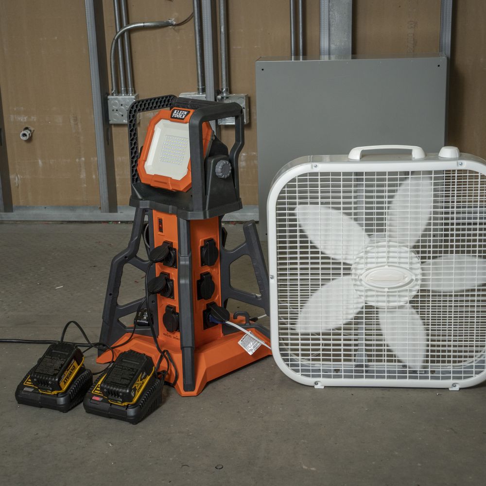 Distribute power and lighting to the Jobsite from a central location with the Klein Tools PowerHub (Cat. No. 29610). The space-saving, vertical design keeps electrical plugs off the ground by stacking six covered, surge-protected 120V outlets. The built-in GFCI removes the need for additional GFCI adapters. Brighten up dimly lit areas with the adjustable, 5,000-lumen LED work light. Easily carry to any location by grabbing the rugged, exoskeleton handles that are conveniently located on the top and sides of the PowerHub.