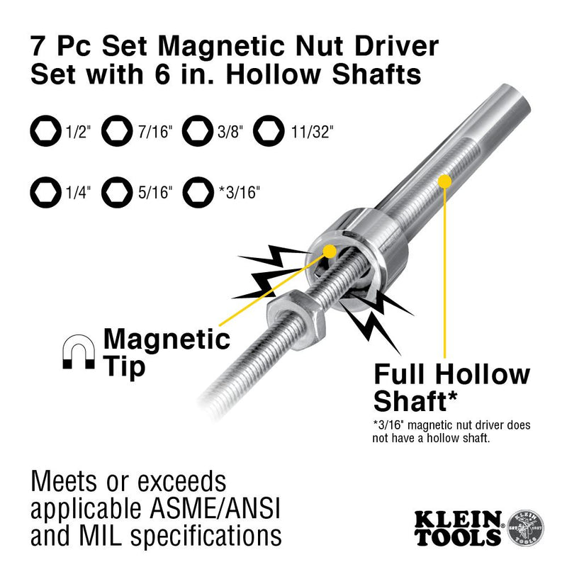 Enjoy quality, American-made craftsmanship with the Klein Tools 647M Magnetic Nut Driver Set. This seven piece set features six inch full hollow shafts for working with long bolts, as well as Rare Earth magnetic tips for keeping bolts in check. The chrome plated shafts resist corrosion and color-coded handle domes offer easy identification. Cushion grip handles ensure maximum comfort on the job.