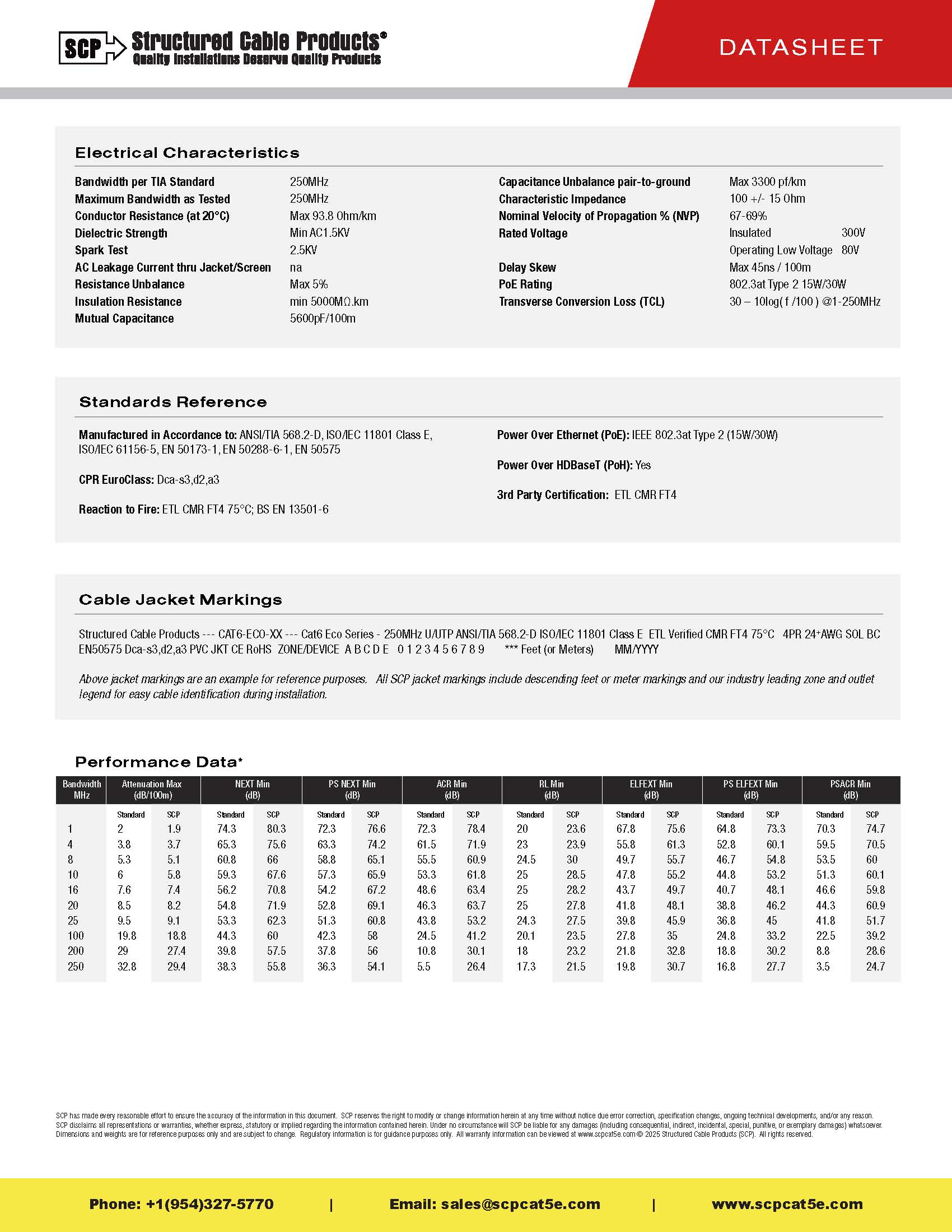 Cat6 Eco Series UTP ETL CMR - 250+Mhz 24+AWG Solid BC, 4PR, U/UTP, Pair Separator, Class E, PoE Type 2 15W/30W, ETL CMR FT4, CPR EuroClass: Dca, PVC Jacket
