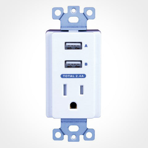 This charger is designed to work with standard single gang trim plates. The USB outlets emit 2.4A of power, which is perfect for most phones, but tablets might require a little more juice. In that case, you'll want to use the USB charger that came with your device and connect it to the standard AC outlet. Installation does require some wiring, so you may want to consult an electrician for safety and effectiveness.