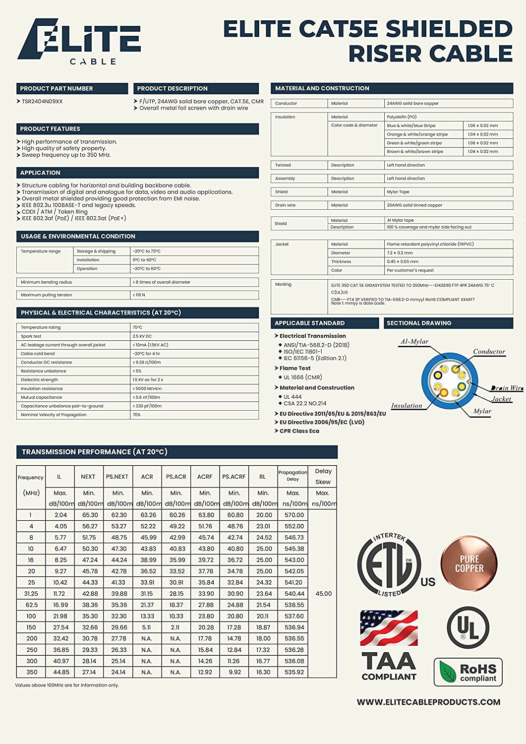 ABA Elite Cat5e Shielded Riser (CMR) Cable is 1000ft, 24AWG, 4 Pair, Foil Twisted Pairs (FTP), Solid Pure Copper Conductors for optimal signal strength. Top rated performance with 3 - 5 DB extra margin over EIA/TIA-568.2-D Standards. Fluke Tested. Suitable for PoE, PoE+.