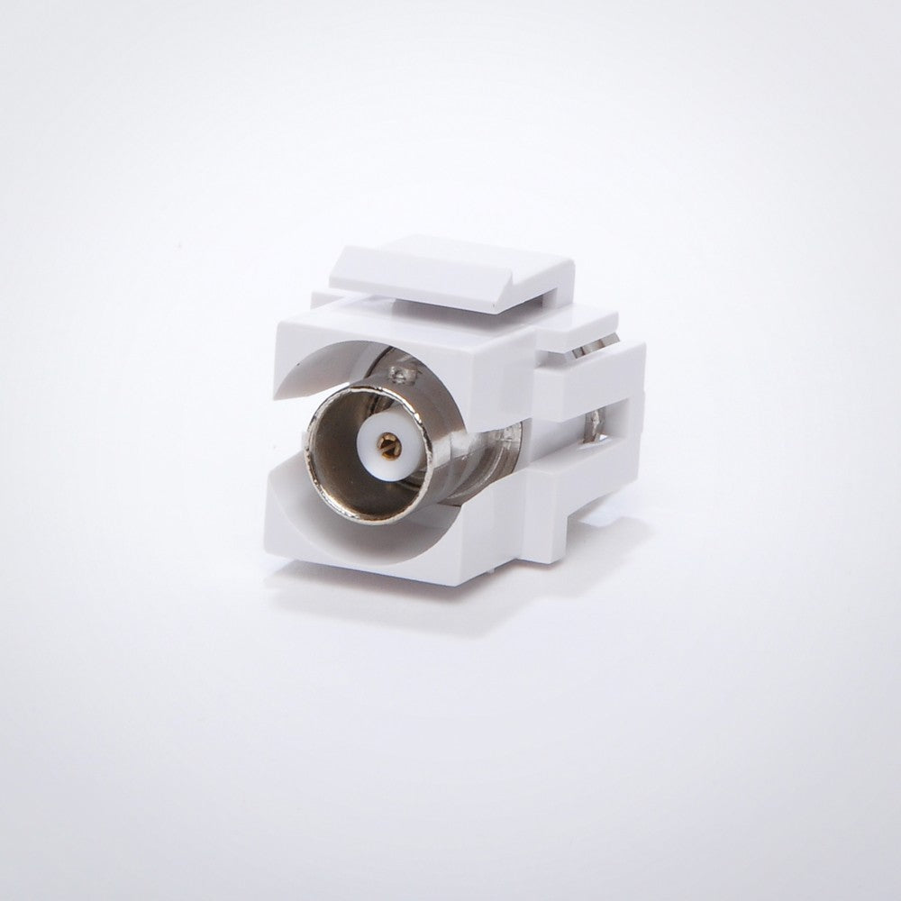 This is a snap-In BNC Female to Female Keystone Jack. It has a white, molded plastic exterior to cover the nickel-plated BNC coupler. Use this product when running coaxial cable through walls to provide a convenient port close to your equipment.