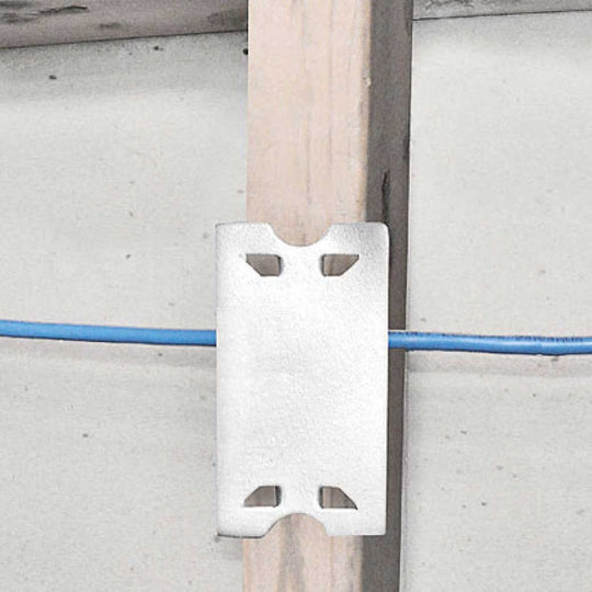 When low voltage cables are installed through wood studs during construction, there's always the potential someone can accidentally cut, nail or drill through them. Now, make sure your wiring doesn't get damaged with a steel safety plate from Garvin Industries. These plates are designed to be hammered into upright wood studs to ensure no one can penetrate through to the cables. They have built-in prongs to attach to the stud, so you don't even need additional nails or screws. They're quick and easy to install and keep you from having to replace and re-run wiring.
