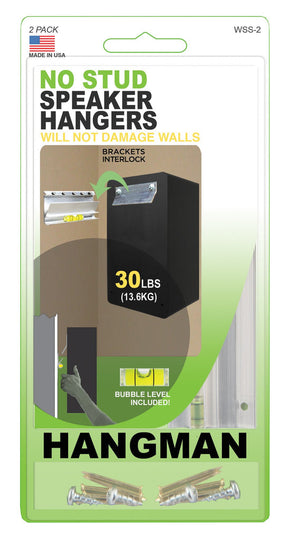 Mount speakers in minutes with No Stud Speaker Hangers. Our patented system uses tiny picture hanging nails to hang speakers up to 30 lbs. each without damaging walls. Two interlocking aircraft-grade aluminum brackets provide extraordinary strength. A foam pad on the wall bracket protects walls from scuffing. Simply mount one bracket on the speaker with included screws, then install the wall bracket with a hammer, tapping tiny picture nails into drywall, plaster or paneling. These nails leave only pinholes upon removal. No screws, studs, or drilling necessary. An included level guarantees straight installation.
