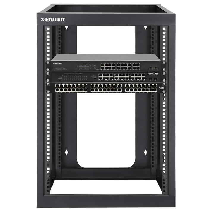 The 6U 19" Wall Mount 4-Post Open Frame Network Rack from Intellinet Network Solutions is a simple, cost-effective way for housing IT equipment in secure environments that don't require a lockable rack solution. It's a great fit in places where small rack solutions are often dispersed throughout an organization, like at a remote location or branch office. Its relatively compact design lets you place it out of the way on a desk or mount it on a wall instead of taking up floor space.