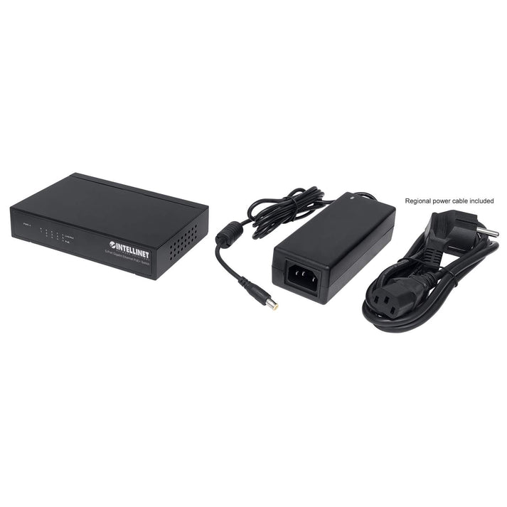The Intellinet Network Solutions 5-Port Gigabit Ethernet PoE+ Switch passes both data and electrical power to a number of PoE-compatible devices via standard Cat5e or Cat6 network cables. Equipped with five Gigabit Ethernet ports — four of which are high-power PoE+ PSE ports — this switch can power wireless LAN access points and bridges, VoIP phones, IP video cameras and more while delivering network speeds of up to 1000 Mbps.