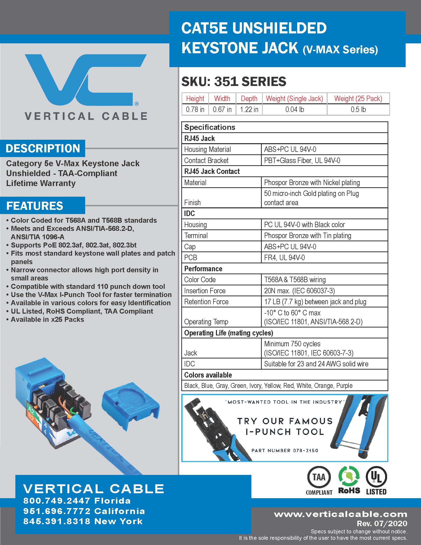 - Certifications: ETL component; UL listed; ANSI/TIA/EIA-568-B.2;ISO/IEC 11801 Class E; FCC