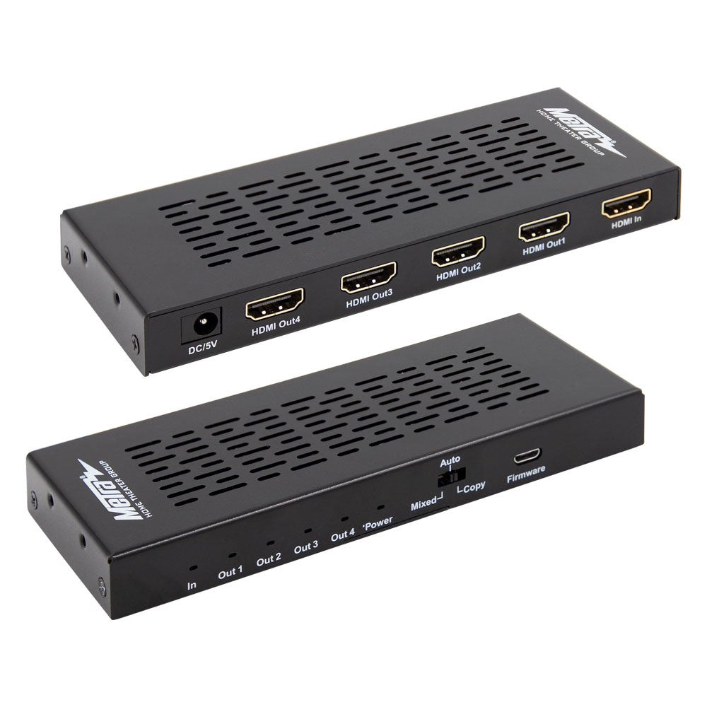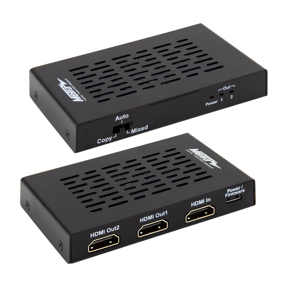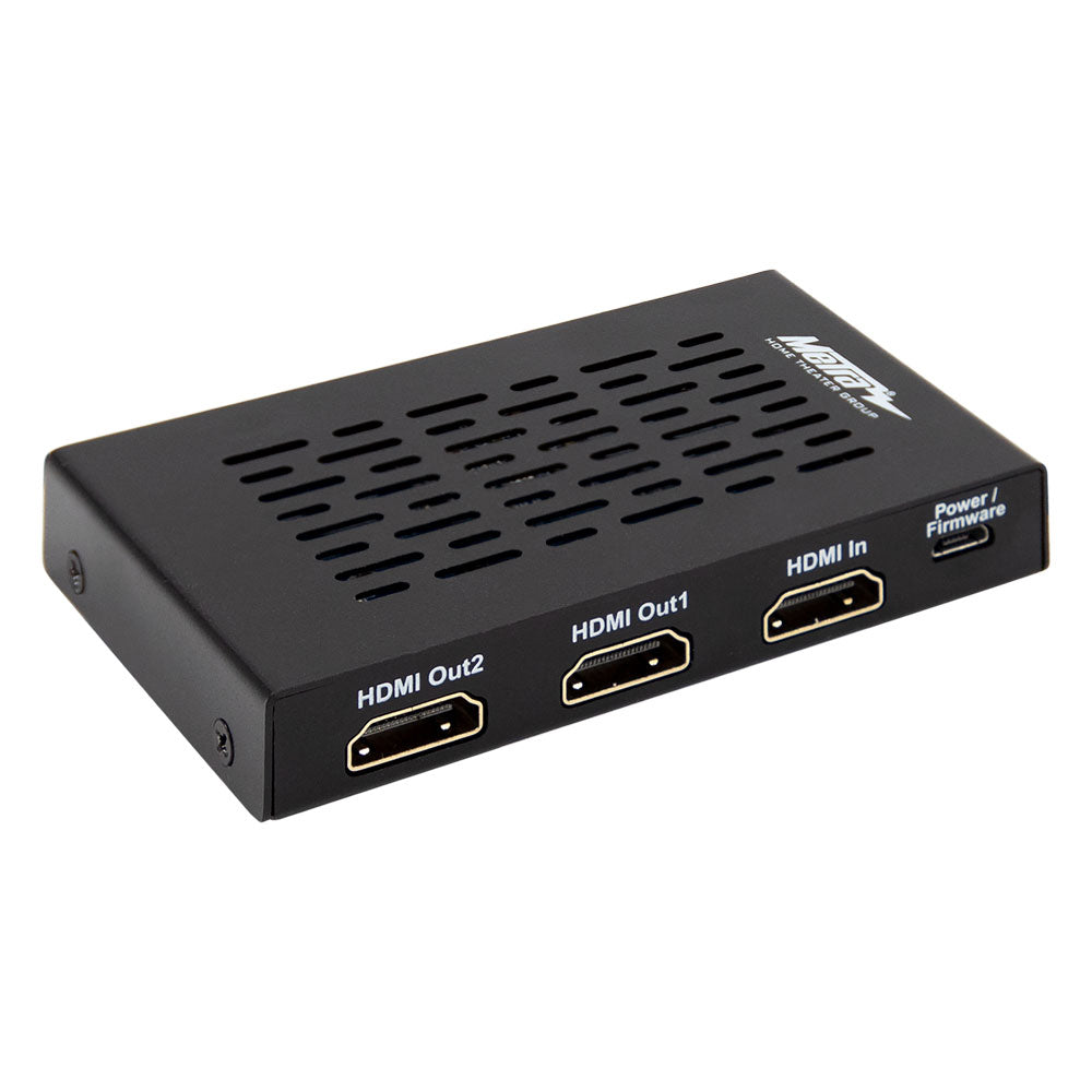 The Metra HDMI splitter with built-in scaling provides the ability to take any standard resolution and downscale it to match each of the connected displays (up to 2), simultaneously. For example, show 4K@60Hz content on a 4K display while also showing the same content scaled down on a 1080p display. Unlike traditional splitters, this built-in scaling allows legacy devices to work with newer higher resolution displays in the system, without automatically defaulting to the lowest resolution. Video quality on newer TVs is no longer sacrificed by having an older model in the mix.