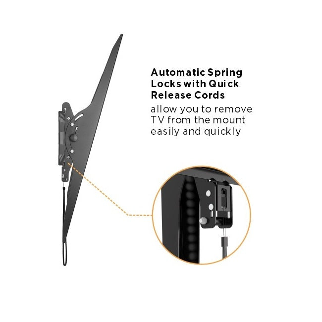 Sturdy steel construction provides solid and long-lasting performance. High quality power-coated finish provides a stylish anti-scratch surface. Width adjusts to fit most larger TV sizes. Open architecture allows for increased ventilation and easier access to wires. Tool-less tilt allows for effortless positioning. Automatic spring locks with quick release cords allow for quick and easy TV removal.